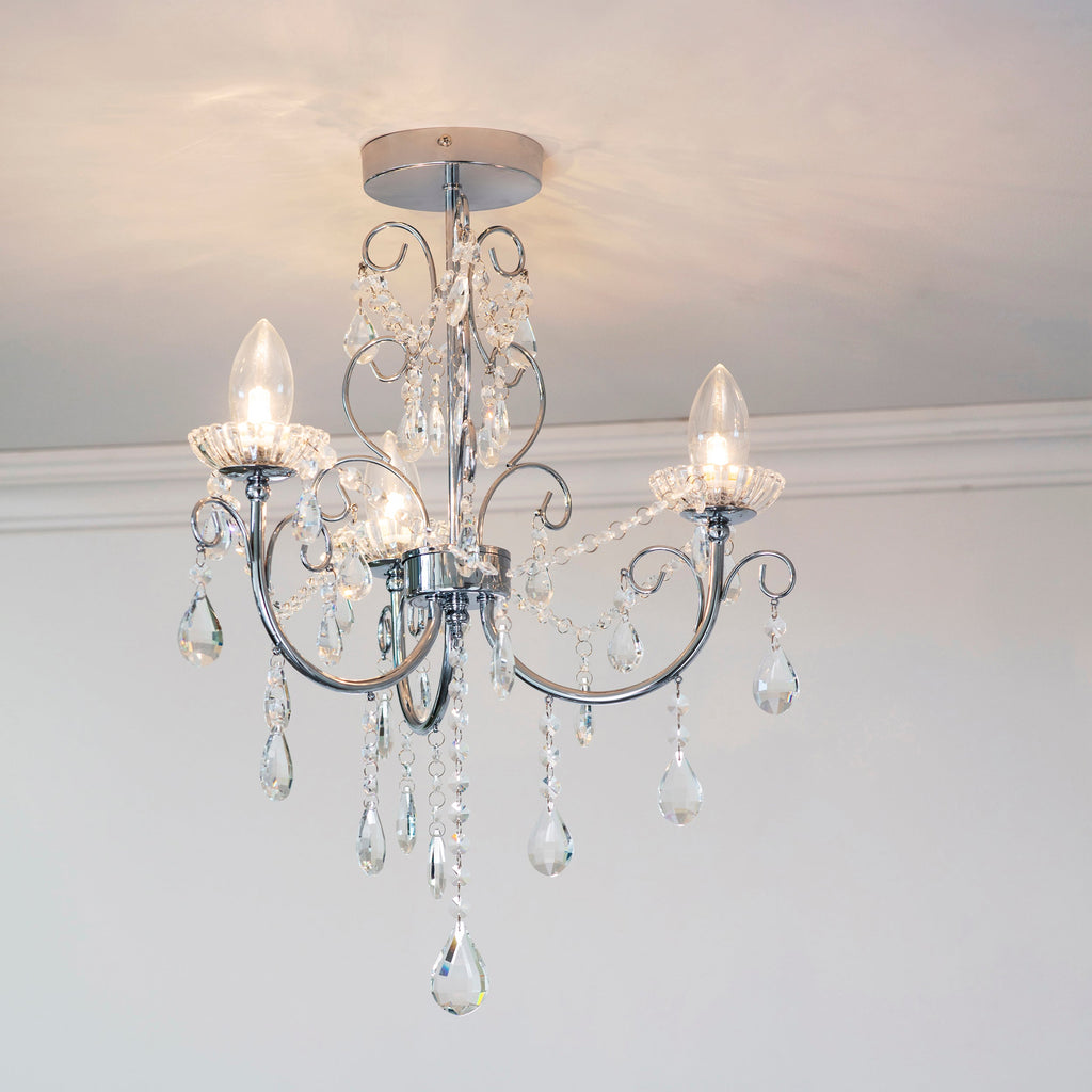 - Prod Description: The Tabitha 3 light semi flush ceiling fitting is finished in a chrome effect plate with clear crystal glass detail and droplets. IP44 rated so suitable for use in the bathroom, dimmable and suitable for use with LED lamps. Matching items available