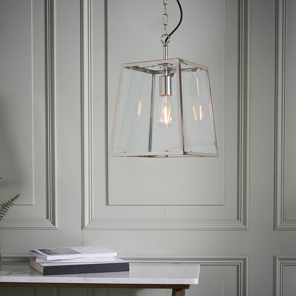 - Prod Description: Inspired by box lanterns, this ceiling pendant is the perfect complement for today's relaxed classic interiors. Finished in bright nickel and suspended from height adjustable chain with black fabric flex. Pair with vintage style filament LED lamps that are perfectly framed by the subtle tapered metalwork and large clear glass panels.
