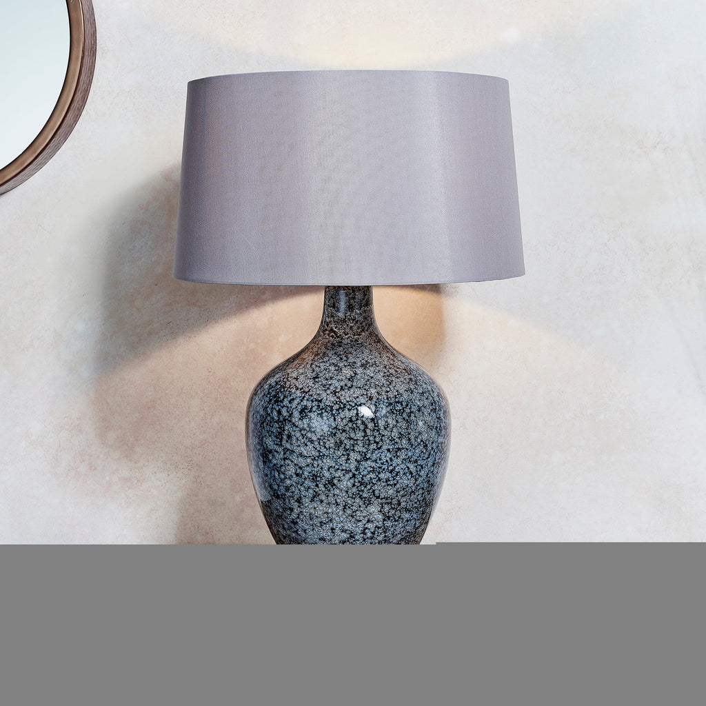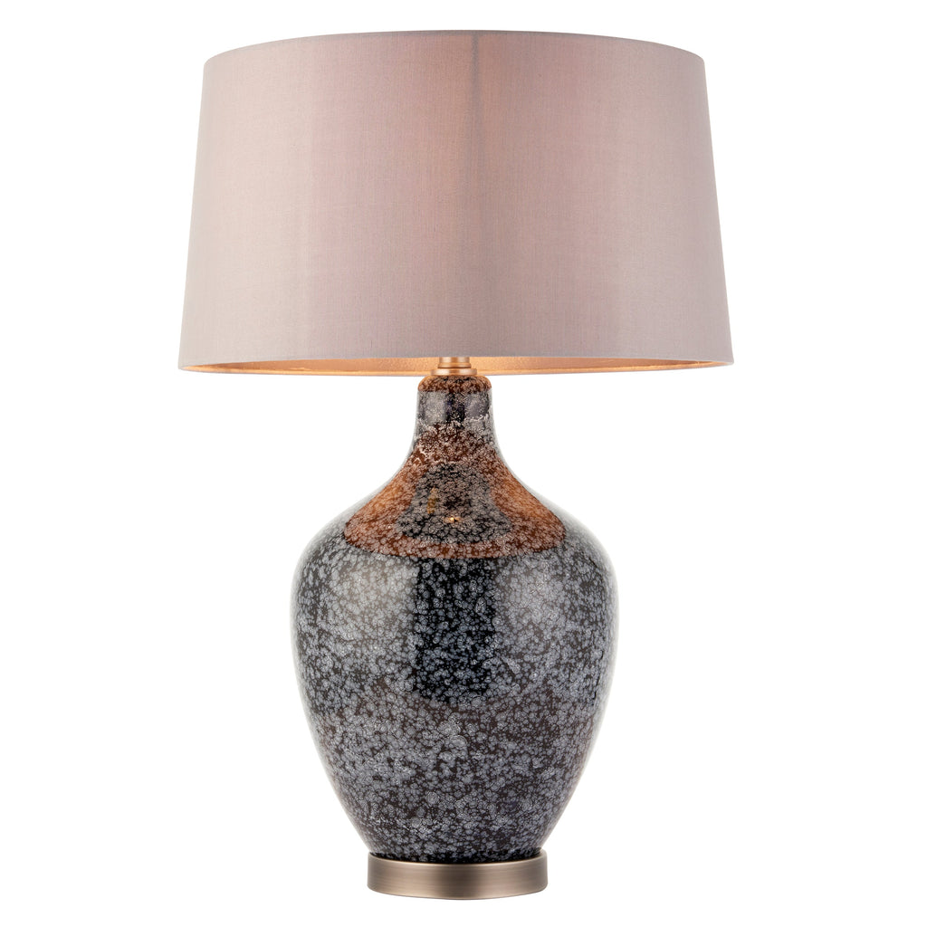 - Prod Description: An elegantly shaped black glass table lamp with grey speckled details, perfectly partnered with a mink faux silk tapered shade.