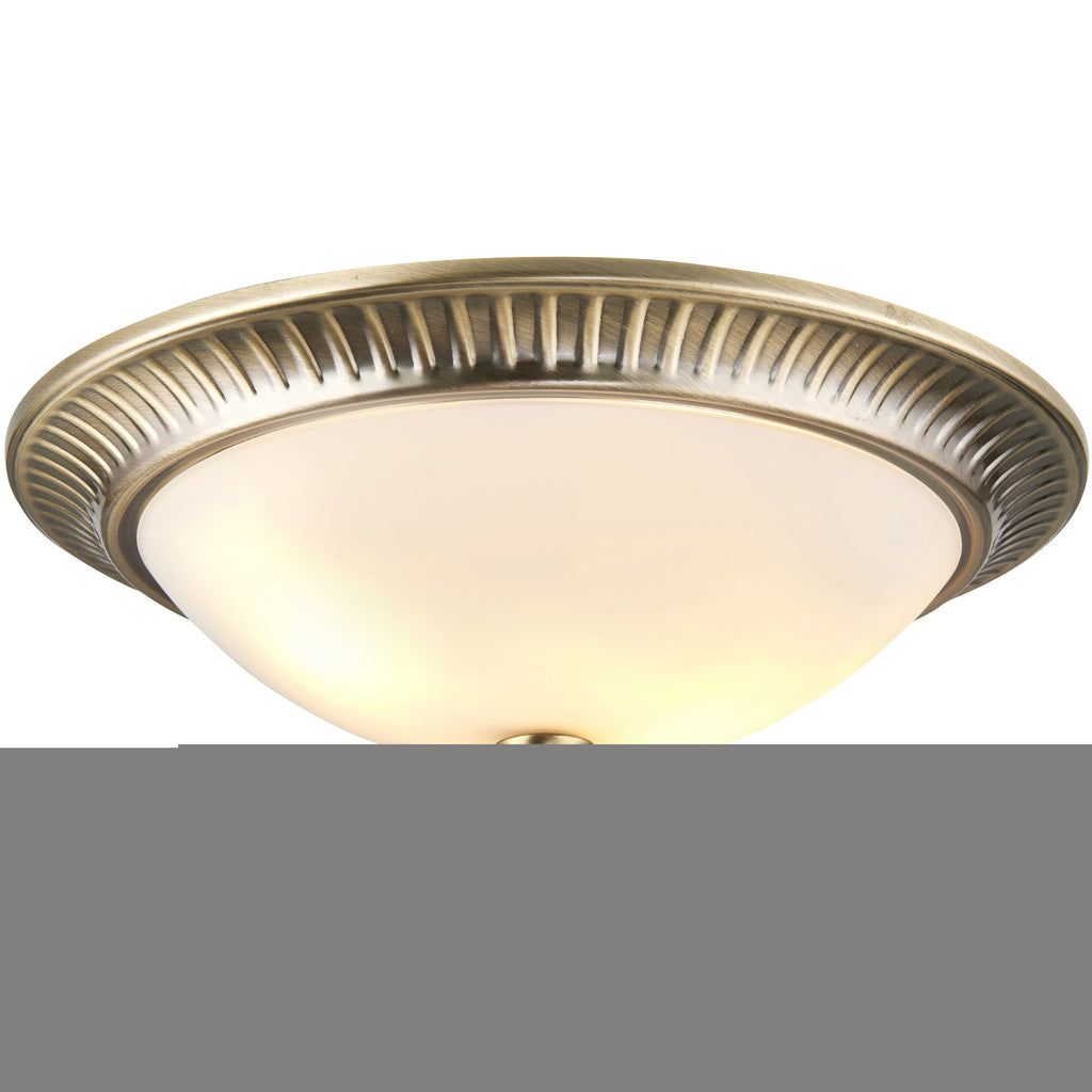 - Prod Description: A flush ceiling light in an antique brass finish, with acid glass shade. suitable for use with LED lamps and dimmable. Matching wall light available