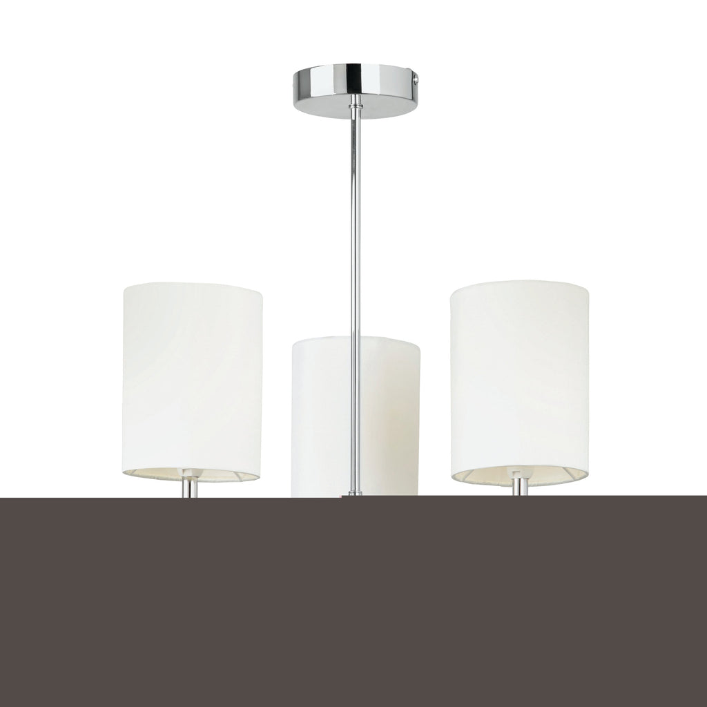 - Prod Description: This 3 light ceiling light has a chrome finish and is complemented with 3 off white faux silk shades. suitable for use with LED lamps and dimmable. Matching items and other colour options available
