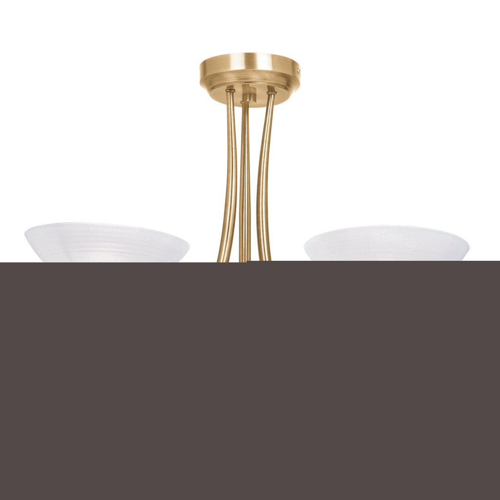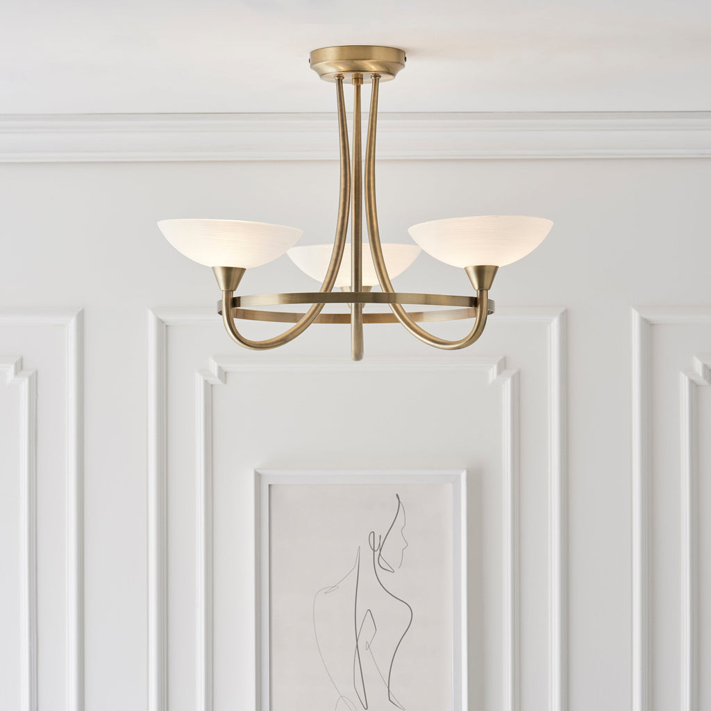 - Prod Description: The Cagney 3 light semi flush is finished in antique brass effect with white painted glass shades with faint line detailing. suitable for use with LED lamps and dimmable; matching 5 light semi flush and wall light options and satin chrome finish also available