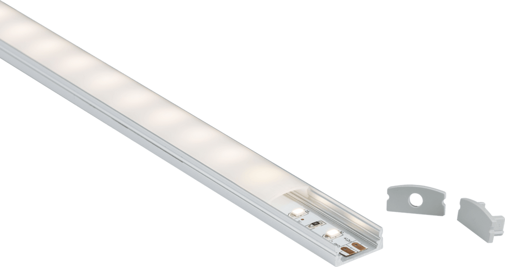 - LED Strip 1 metre flat, surface mount aluminium profile - Ideal for mounting under cabinets or shelving - Includes 2 mounting clips, 1 metre opal diffuser and 2 end caps Compatible with max. 12mm width LED flex *Additional mounting clips and end caps available (sold separately: 1MSURCAP)