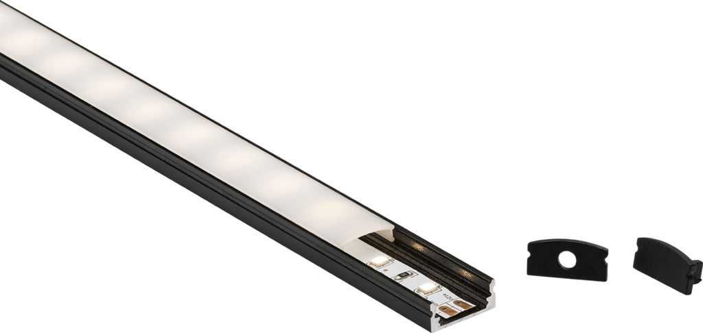 - LED Strip 1 metre flat, surface mount aluminium profile - Powder-coated matt black finish - Ideal for mounting under cabinets or shelving - Includes 2 mounting clips, 1 metre opal diffuser and 2 end caps Compatible with max. 12mm width LED flex *Additional mounting clips and end caps available (sold separately: 1MSURBKCAP)