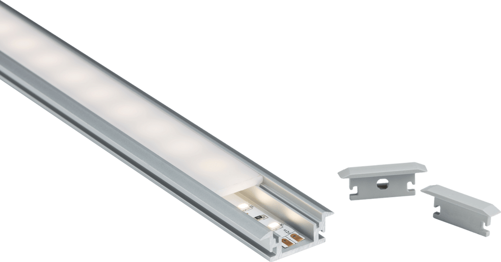 - LED Strip 2 metre flat, recessed mount aluminium profile - Ideal for floor installation - Includes 4 mounting clips, 2 metre opal diffuser and 2 end caps Compatible with max. 12mm width LED flex *Additional mounting clips and end caps available (sold separately: 1MFLRCAP)