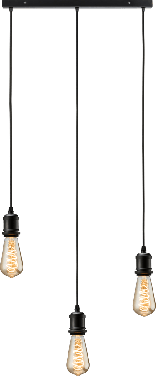 - 3 light bar ceiling pendant with vintage style lamp holders, in a matt black finish. Each drop has 1.8m black fabric flex cable, where height can be adjusted independently. Fitting is stylish on its own or accompanied with filament lamps and cages/ shades, to create different look and style within a roomset. - Each lamp has 1.8m cable - Adjustable cable length 3 x E27 lamps (40W max., not included)