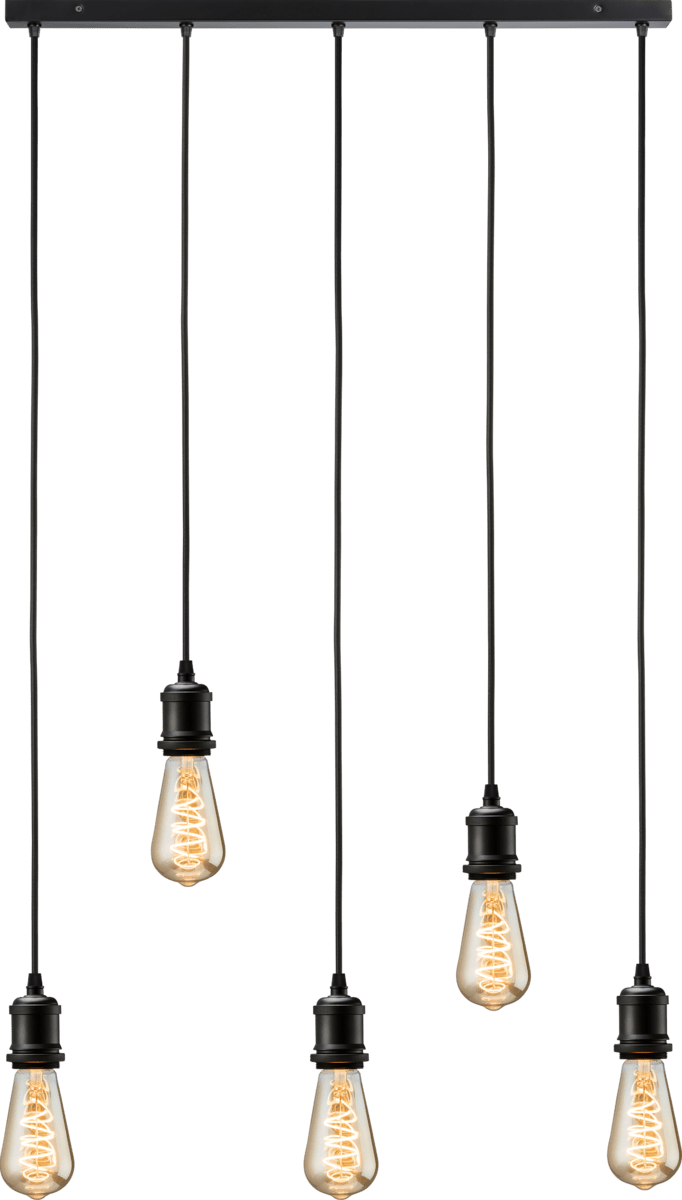 - 5 light bar ceiling pendant with vintage style lamp holders, in a matt black finish. Each drop has 1.8m black fabric flex cable, where height can be adjusted independently. Fitting is stylish on its own or accompanied with filament lamps and cages/ shades, to create different look and style within a roomset. - Each lamp has 1.8m cable - Adjustable cable length 5 x E27 lamps (40W max., not included)