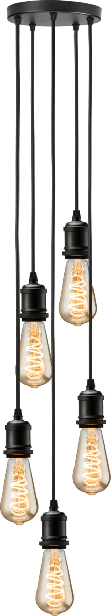 - 5 light cluster ceiling pendant with vintage style lamp holders, in a matt black finish. Each drop has 1.8m black fabric flex cable, where height can be adjusted independently. Fitting is stylish on its own or accompanied with filament lamps and cages/ shades, to create different look and style within a roomset. - Each lamp has 1.8m cable - Adjustable cable length 5 x E27 lamps (40W max., not included)