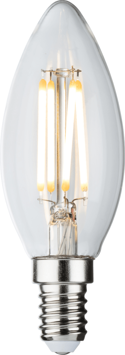 - 230V 4W SES (E14) LED Filament Clear Candle Lamp- 35mm LED filament technology to replicate the look of a traditional incandescent lamp. - Replacement for a 40W incandescent lamp - Dimmable - 2700K, Warm White, 485lm *Compatible with most trailing edge dimmers, please check compatibility before installation