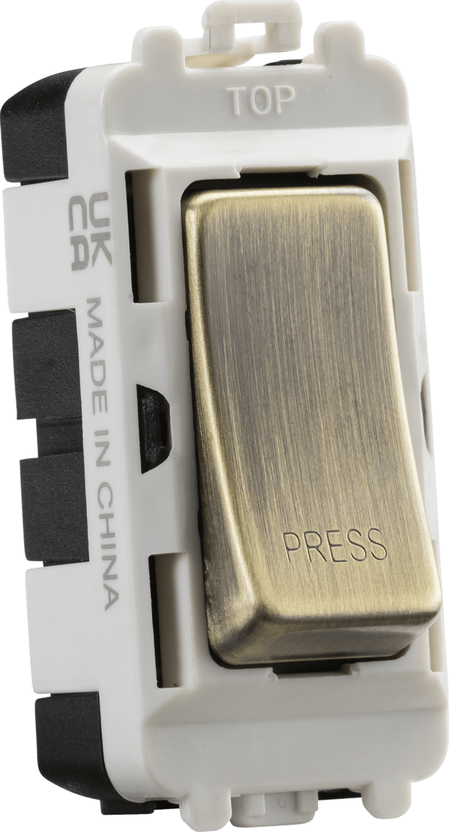 - Module simply clips into position from the front of the mounting frames (sold separately) - 20AX - 2-way - Single Pole - Retractive Switch marked PRESS - For use with the Knightsbridge Grid system