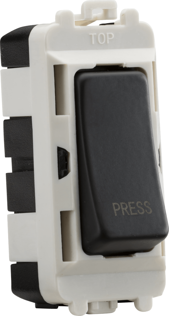- Module simply clips into position from the front of the mounting frames (sold separately) - 20AX - 2-way - Single Pole - Retractive Switch marked PRESS - For use with the Knightsbridge Grid system