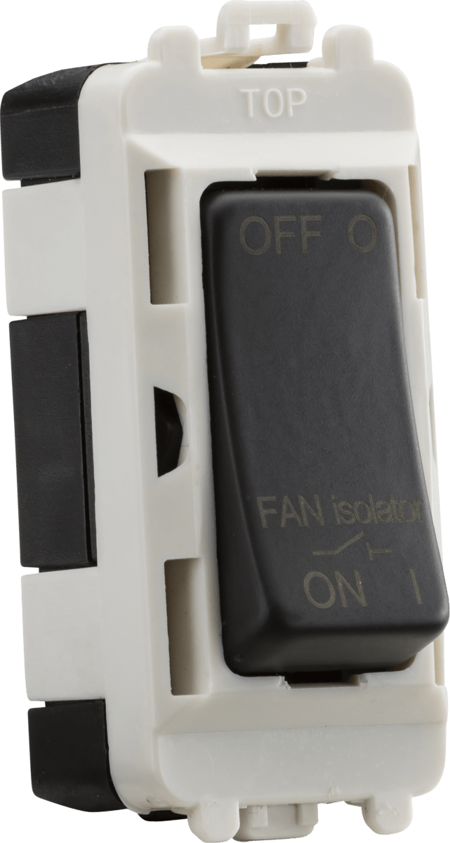 - Single sized grid fan isolator module. Module simply clips into position from front of the mounting frames (sold separately) - 10A - Triple Pole - Engraved FAN ISOLATOR - Rated conditional short circuit current (Inc) 1500A - For use with the Knightsbridge Grid system