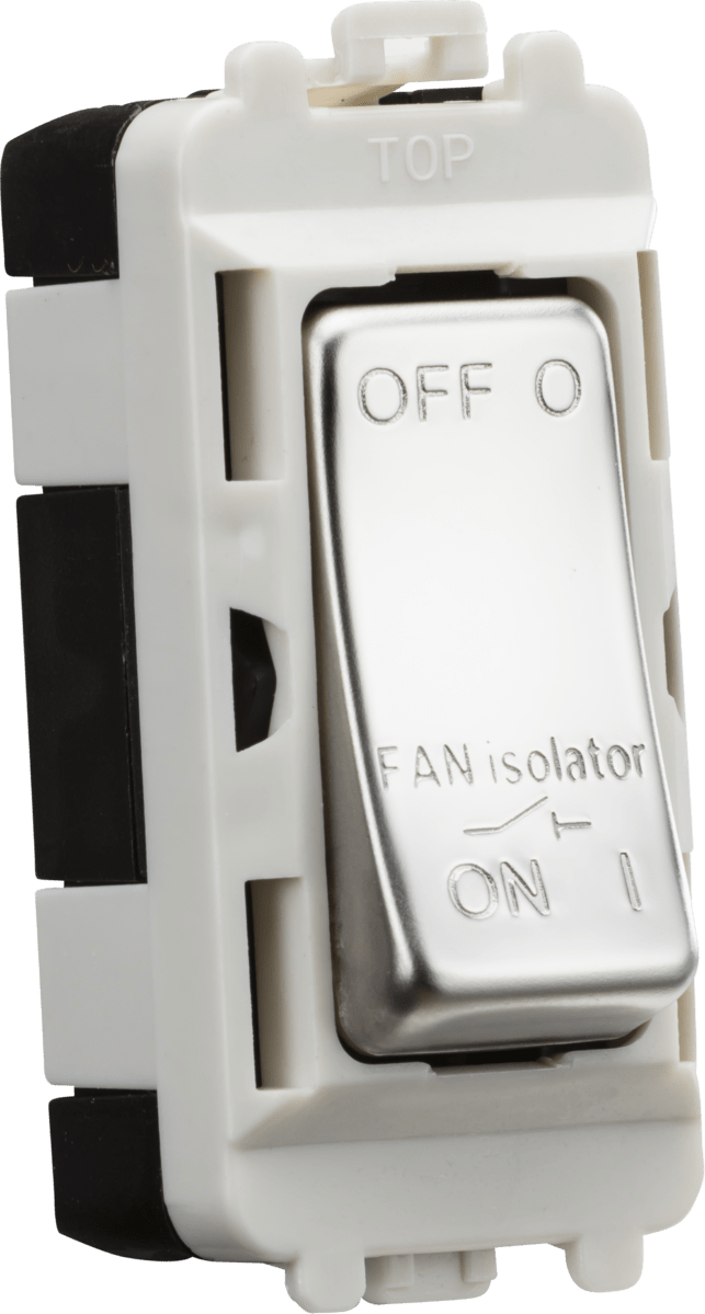 - Single sized grid fan isolator module. Module simply clips into position from front of the mounting frames (sold separately) - 10A - Triple Pole - Engraved FAN ISOLATOR - Rated conditional short circuit current (Inc) 1500A - For use with the Knightsbridge Grid system