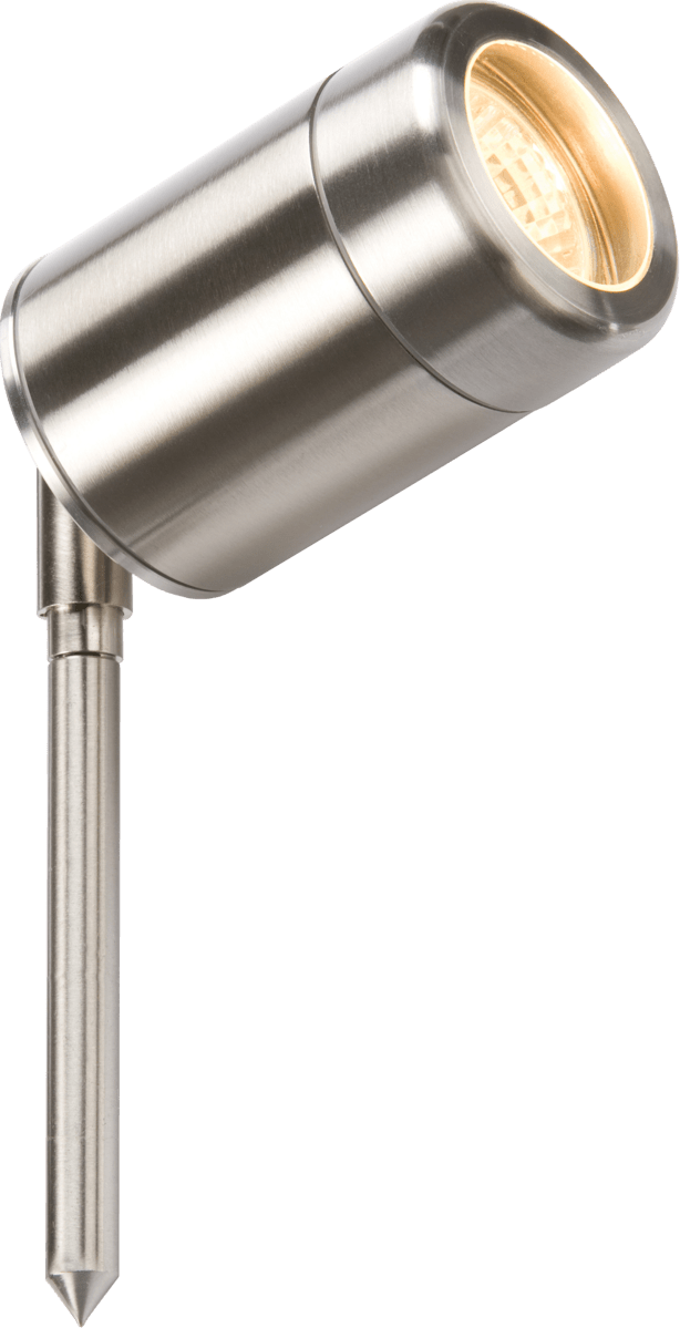 - 230V IP65 GU10 garden spike spotlight. - 304 Stainless steel - Prewired with 3m outdoor cable - Suitable for halogen or LED GU10 lamps - Max. 35W