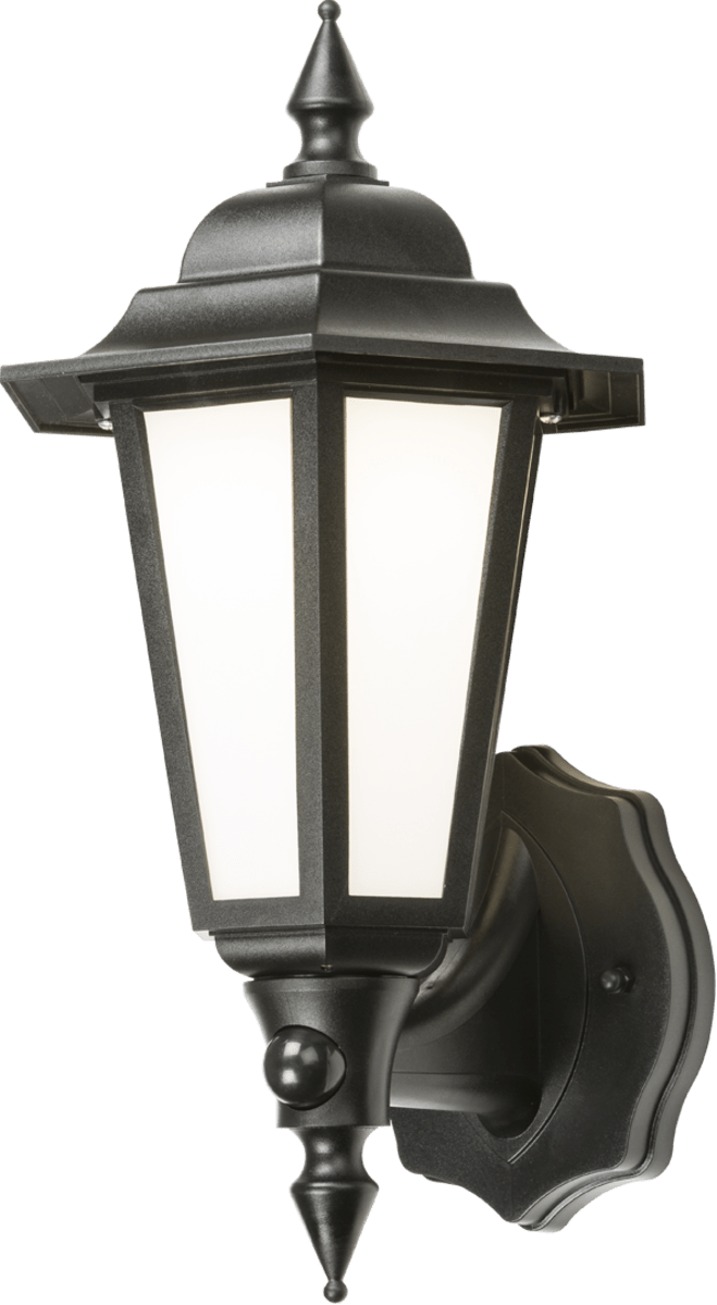 - 230V IP54 8W LED PIR Wall Lantern- 4000K- Black - Polycarbonate structure and diffuser - Durable, corrosion resilient - Low-maintenance, long-life - Detection range: up to 8m - PIR detection angle: 90 ° - Manual Overide 4000K, Cool White, 400lm
