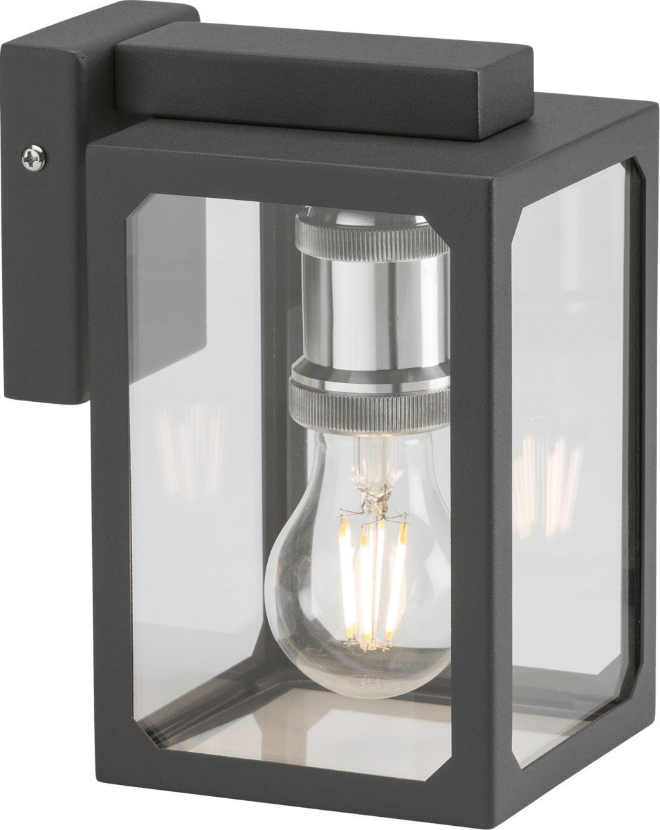 - 230V IP23 E27 modern classic wall lantern. - Stainless steel with clear glass - Powder coated anthracite finish - LED compatible Suitable for indoor and outdoor use E27 40W max (lamp not included)