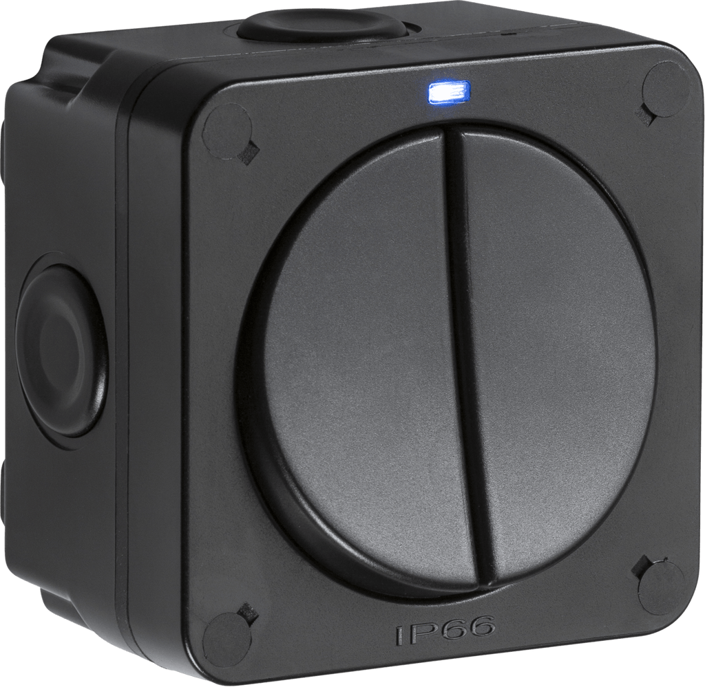 - Outdoor switch with blue LED activity/location feature. - Manufactured from robust, high impact grade polycarbonate for a long life - Black finish with unique semi-circular rocker switches - IP66 / IK06 rated - 20AX 2G 2-way switch function - Multiple 20mm cable entries/exits allow for optimum positioning - Certified to BS EN 60669-1