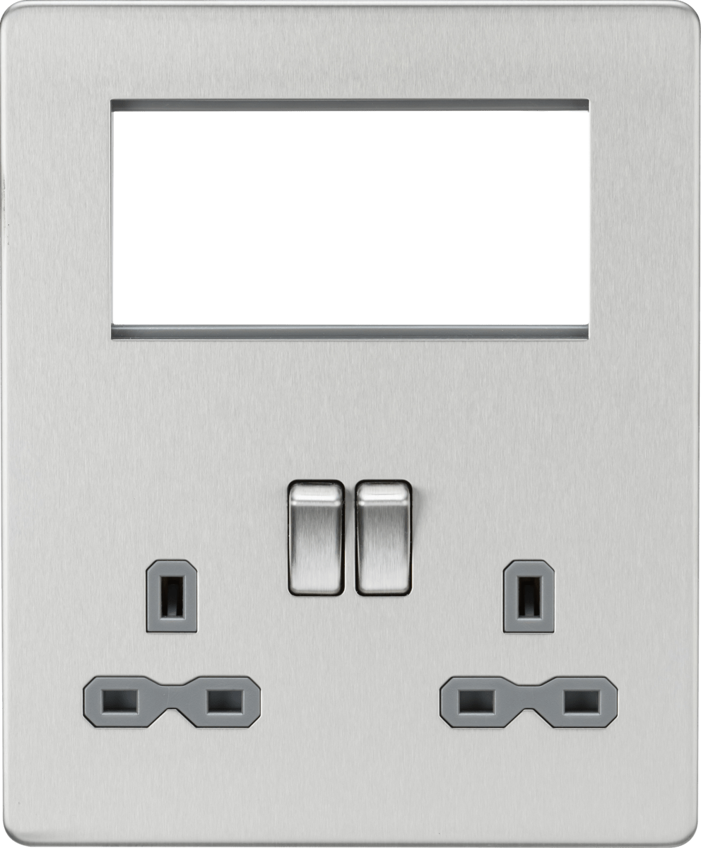 - Essential for any major upgrade, renovation or new build. The Screwless Multimedia Combination Plate allows for a power and bespoke signal distribution solution to be combined in one area. Compatible with our extensive range of modular inserts this plate can be configured to suit your requirements, be it Satellite TV, DAB, Telecoms, Networking or even USB Charging. - 230V 13A - Double Pole Switches - 1 x 2G Double Sockets with Twin Earth - Space for up to 4 x Euro module inserts (25 x 50mm)