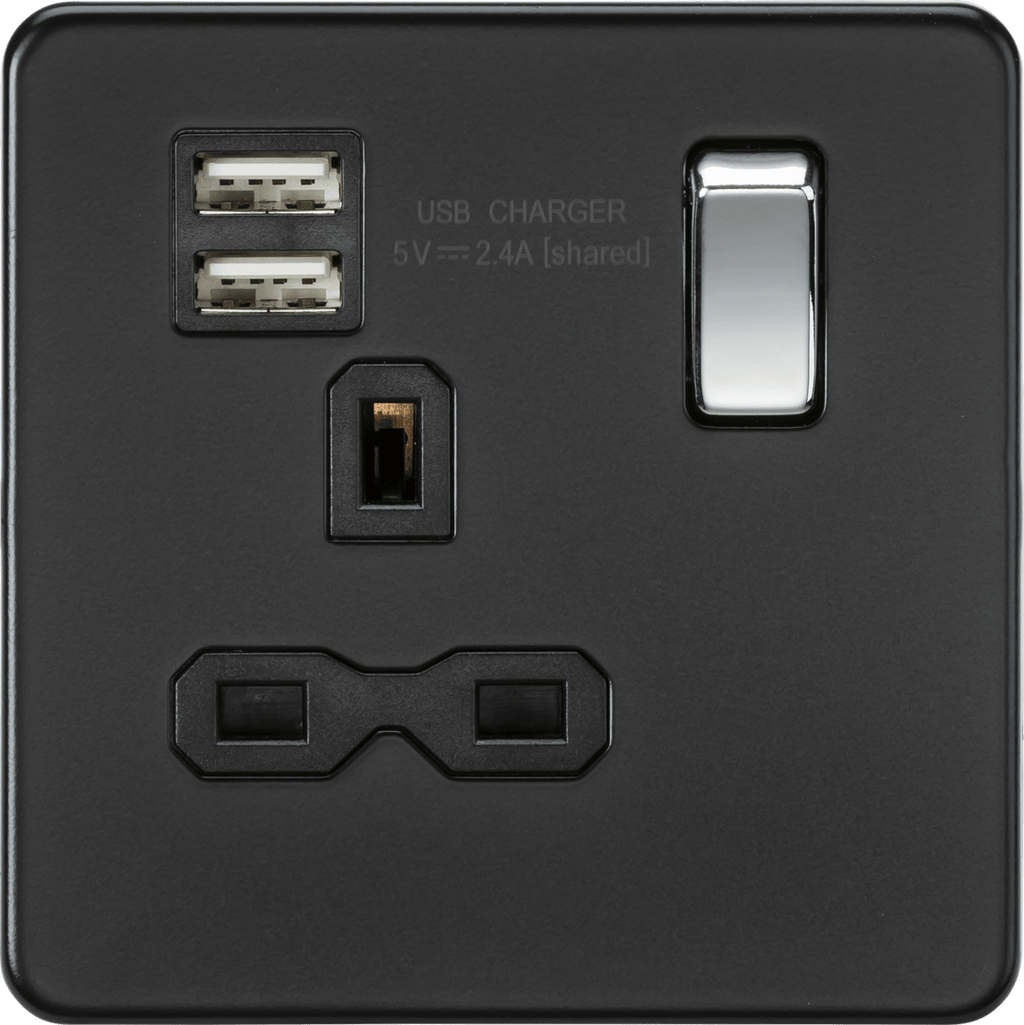 Knightsbridge MLA SFR9124MB Screwless 13A 1G switched socket with dual USB charger (2.4A) - matt black with chrome rocker