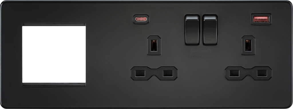 - Essential for any major upgrade, renovation, or new build. The Screwless Socket and 2G Modular Combination Plate allows for a power, fast charge USB and bespoke modular solutions to be combined in one area. Capable of delivering a 0-50% charge to compatible USB devices in under 30 mins. Offering both legacy USB-A for older phones and the latest USB-C for modern devices. Compatible with our extensive range of modular inserts this plate can be configured to suit your requirements. Product code explanation: - "L" - designates 2G Socket on the left and 2G modular on the right - "R" designates 2G Socket on the right and 2G modular on the left Features - Double pole switches provide additional safety - Twin earthing points for high integrity earthing requirements - Dual USB outlets C+A - 5V DC 4.0A [shared] - Compatible with QC (Quick Charge) and USBPD (USB Power Delivery) - Space for up to 2 x Euro module inserts (25x50mm or 1 x 50x50mm) - Constructed from high quality components and materials to ensure the longevity of the install - Fully certified to the latest British Safety Standards Benefits - USB sockets capable of delivering up to 18W - Over Voltage Category III – suitable for domestic and commercial installations - Built in overheat and overload protection - ErP Ready (0.1W in stand-by mode) - Min. mounting box depth of 35-47mm depending on wiring conditions we recommend product code GSK335D (35mm) or GSK347D (47mm) for use with this product WE RECOMMEND ONLY USING CERTIFIED USB CABLES FOR SAFETY, OPTIMUM PERFORMANCE AND TO ENSURE COMPATIBILITY IMPORTANT: THE DEVICE CONTROLS THE POWER BEING DRAWN, NOT THE SOCKET MOST COMPATIBLE DEVICES WILL ONLY ACTIVATE FASTCHARGE BETWEEN 0-70% BATTERY POWER. AFTER THIS IT WILL REVERT TO STANDARD CHARGING PARAMETERS TO PROTECT BATTERY