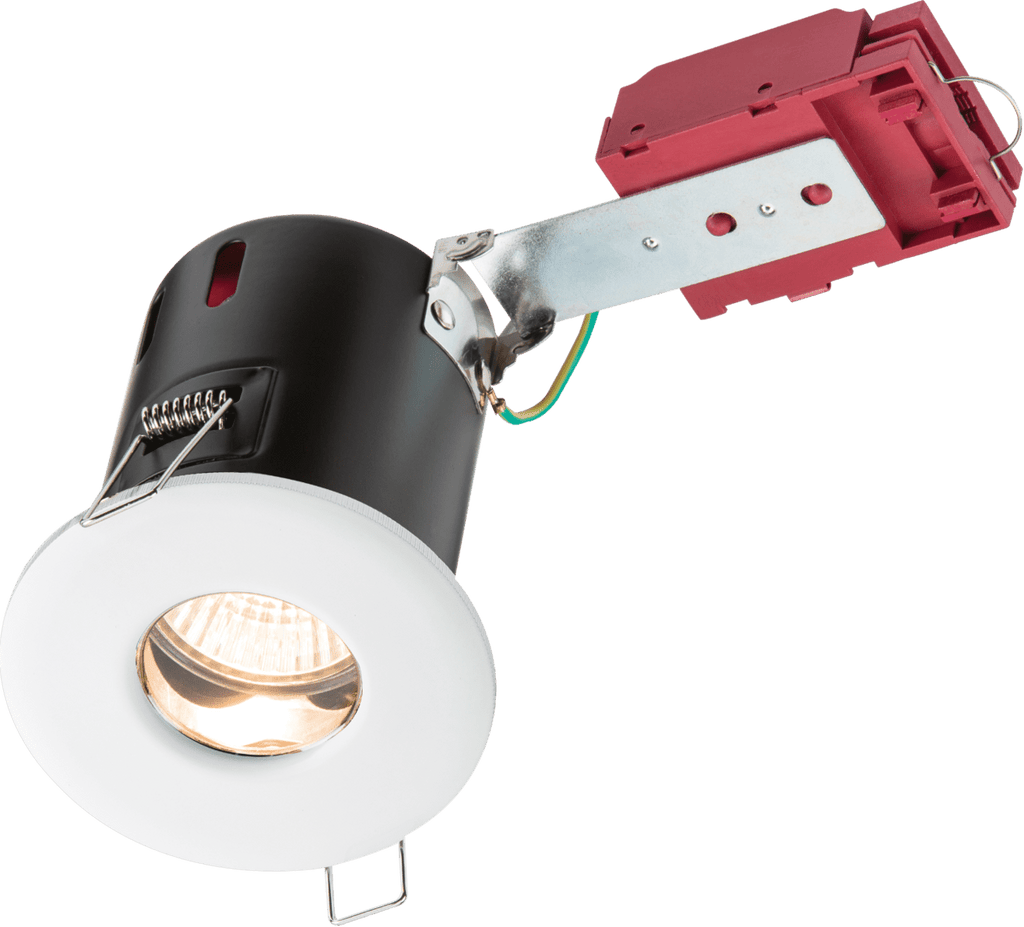 - IP65 Die-Cast GU10 Insulation Compatible Downlight, White. GU10 35W max. Class 1, must be earthed. Twist and lock front ring to secure lamp. Compatible with standard GU10 Halogen and ideal for true retrofit LED and CFL lamps. Electrical termination via 10 Amp connector block within secure enclosure supplied with cord grip. Dimmable. Spring clip fixings with a recommended maximum ceiling thickness of 30mm. Tested to: - BS476 Part 21 & 23 - Building Regulations Part B (Fire Safety) compliant - Tested to 30/60/90mins - Solid Wood Joists