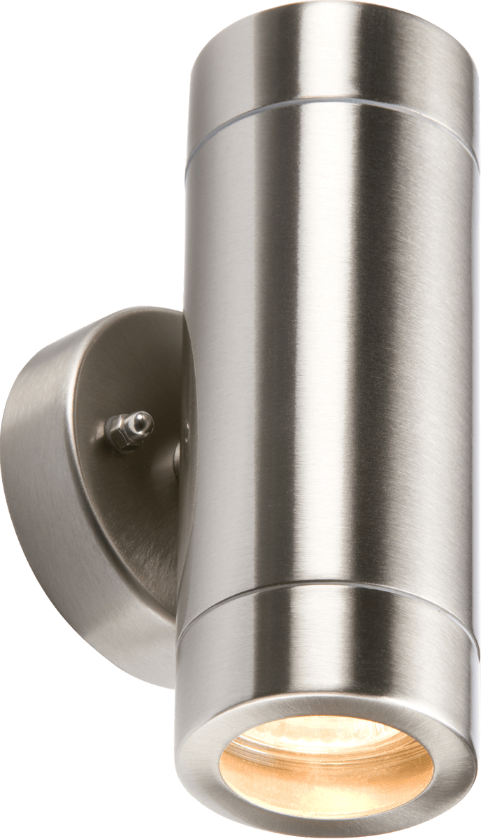 - IP65 35W GU10 Stainless Steel Grade 304 Mains Double Fixed Wall Light. 2 x GU10 lamps (not supplied with fitting - product code GU5L or GUC5). Electrical termination via 10 Amp internal connector block at base. Light 1mm gauge. Surface mounted wall light. Dimmable. *Not suitable for conduit