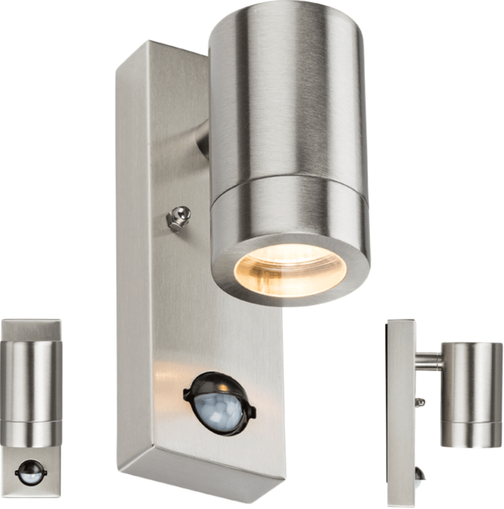 - 230V IP44 GU10 304 stainless steel wall light with PIR motion sensor. Compatible with GU10 halogen and retrofit LED lamps. Requires 1 x GU10 lamps 35W max (not included). - Ideal for all outdoor areas and gardens. - PIR max. distance up to 8m @2.4m height. Detection angle: 110 °. - Sensor can be adjusted for brightness, sensitivity and illumination time Fixture includes a manual override facility.