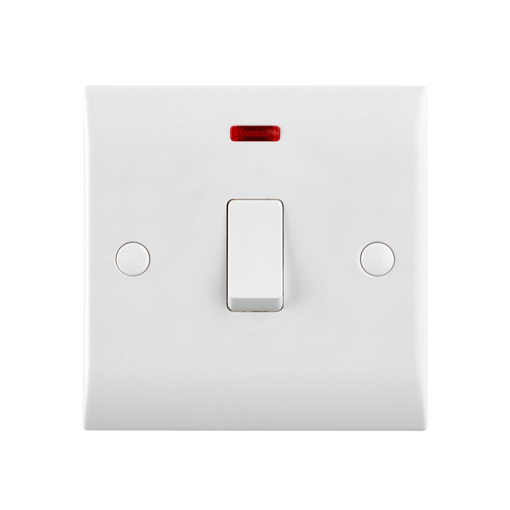 - Our 20A rated switch boasts captive screws which provide for quick, easy and a hassle free installation Supplied with fixing screws & white screw covers for sleek appearance Double pole switching for the peace of mind of a safer installation of your socket Flush neon power indicator on faceplate This has been manufactured using high grade thermoset Urea which effectively inhibits the growth of infectious diseases, including MRSA, E-Coli, Salmonella and Klebsiella Pneumonia bacteria We recommend a minimum mounting box depth of 25mm Certified to IEC/BS EN60669