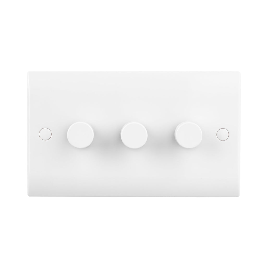 - 5-100W LED Dimmer The dimmer module we use is universal, making it the ideal choice for LED, halogen, CFL and incandescent lamps Supplied with fixing screws & white screw covers for sleek appearance 2 way push on/off with rotary control This has been manufactured using high grade thermoset Urea which effectively inhibits the growth of infectious diseases, including MRSA, E-Coli, Salmonella and Klebsiella Pneumonia bacteria We recommend a minimum mounting box depth of 25mm Certified to IEC/BS EN60669