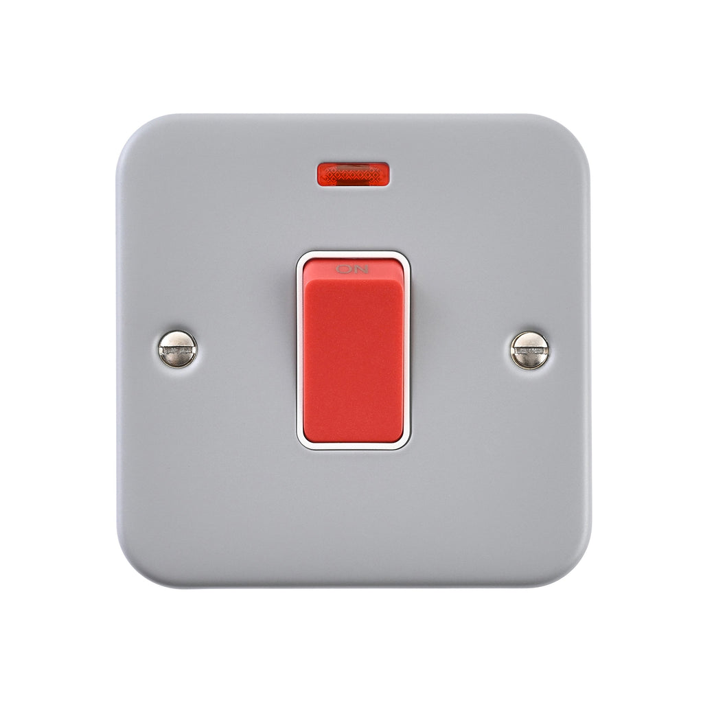 - Our 45A rated switch boasts captive screws which provide for quick, easy and a hassle free installation Supplied with fixing screws Twin earth fitted as standard to allow a double earth facility for installations that require a high integrity protective connection Double pole switching for the peace of mind of a safer installation of your socket Flush neon power indicator on faceplate Multiple knockout entry points on surface box for 20mm conduit giving you complete versatility when installing Finished in a high quality powder coating to help protect against scratches We recommend using a standard metal surface box with a depth of 40mm - MC901 Certified to IEC/BS EN60669