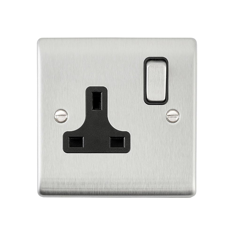 - Raised Screwed 13A 1G DP Switched Socket - Brushed Steel With Black Insert