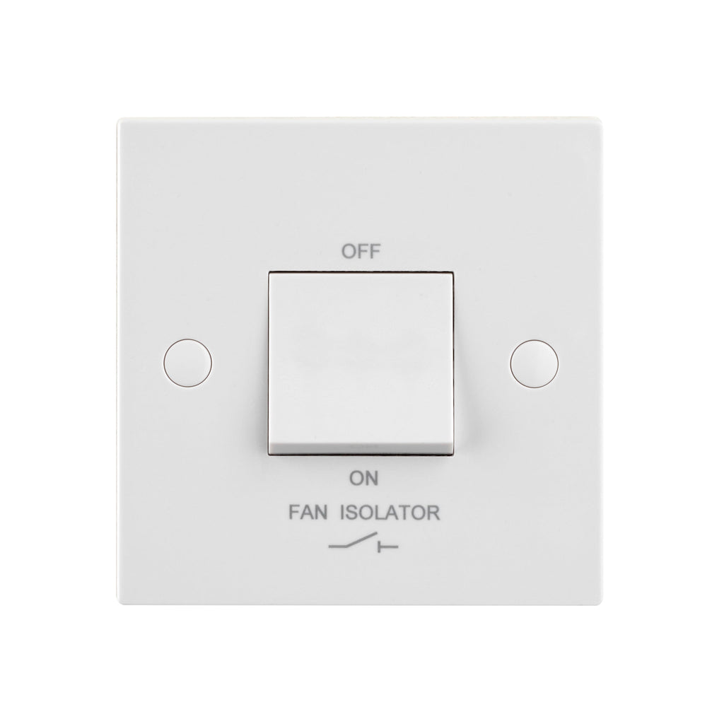 - Our 10AX rated switch boasts captive screws which provide for quick, easy and hassle free installation Supplied with fixing screws & white screw covers for sleek appearance The Fan Isolator switch has a triple pole switching design This has been manufactured using high grade thermoset Urea which effectively inhibits the growth of infectious diseases, including MRSA, E-Coli, Salmonella and Klebsiella Pneumonia bacteria We recommend a minimum mounting box depth of 25mm Certified to IEC/BS EN60669