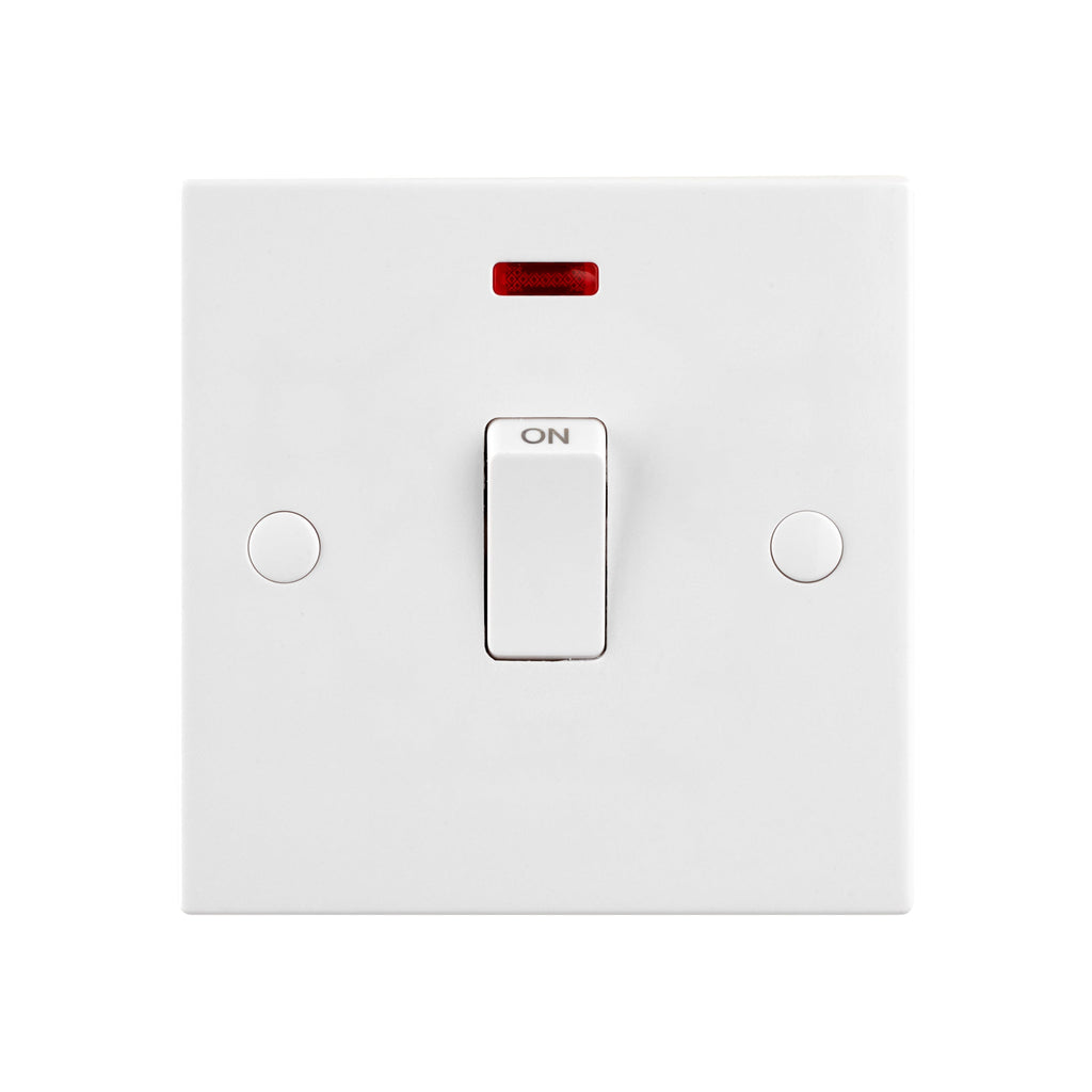 - Our 20A rated switch boasts captive screws which provide for quick, easy and a hassle free installation Supplied with fixing screws & white screw covers for sleek appearance Double pole switching for the peace of mind of a safer installation of your socket Flush neon power indicator on faceplate This has been manufactured using high grade thermoset Urea which effectively inhibits the growth of infectious diseases, including MRSA, E-Coli, Salmonella and Klebsiella Pneumonia bacteria We recommend a minimum mounting box depth of 25mm Certified to IEC/BS EN60669