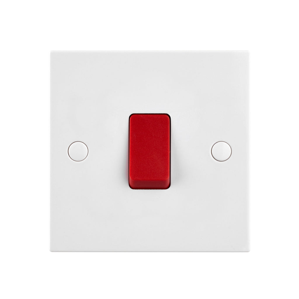- Our 45A rated switch boasts captive screws which provide for quick, easy and a hassle free installation Supplied with fixing screws & white screw covers for sleek appearance Double pole switching for the peace of mind of a safer installation of your socket Twin earth fitted as standard to allow a double earth facility for installations that require a high integrity protective connection This has been manufactured using high grade thermoset Urea which effectively inhibits the growth of infectious diseases, including MRSA, E-Coli, Salmonella and Klebsiella Pneumonia bacteria We recommend a minimum mounting box depth of 47mm Certified to IEC/BS EN60669